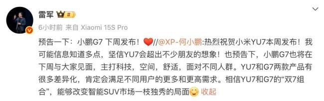 毕竟YU7主打操控驾驶,与G7有一定的区隔,但G7与YU7之间竞争不可避免,甚至是蔚小理之间竞争最大的一个。