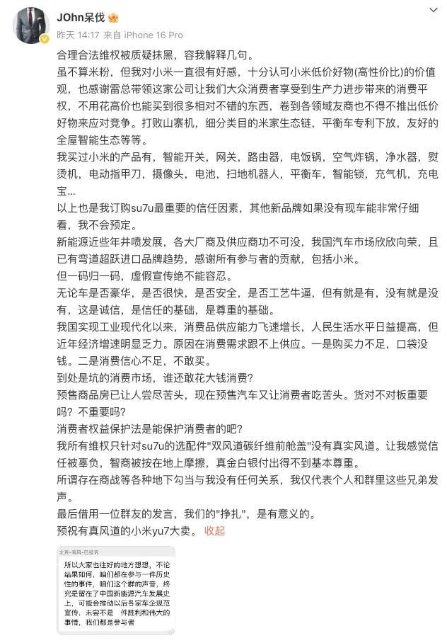 上述博主讲述了自己为什么公开沟通内容,是因为小米至今没有回应车主的诉求。随后在6月22日,该博主进一步表示自己为资深米粉,合理维权却被质疑“抹黑”。其表示,此次风道事件让我自己觉信任被辜负,智商被按在地上摩擦,真金白银付出得不到基本尊重。该博主还强调,未受任何一方指使或者存在利益关系。