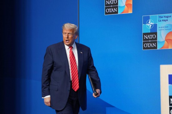 6月25日,在荷兰海牙,美国总统特朗普在北约峰会期间出席新闻发布会后退场。新华社记者赵丁喆摄