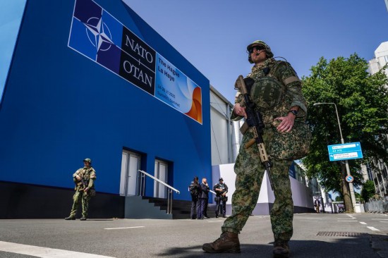 6月23日,在荷兰海牙,安保部队在北约峰会外执勤。新华社记者彭子洋摄