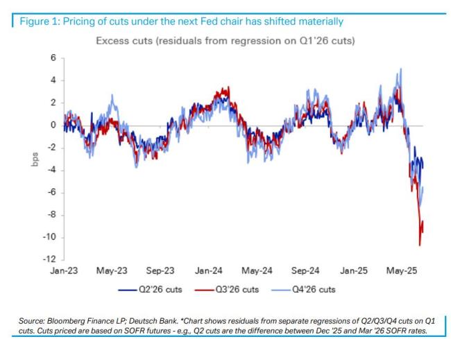 德意志银行通过回归模型发现了一个现象:将明年二、三、四季度的降息定价对第一季度进行回归,通过残差分析衡量远期降息预期相对于第一季度的“异常”程度。过去一个月,这些残差显著转负,特别是2026年第三季度——正值新主席上任期间。这表明市场正在为新主席任期内的异常宽松政策定价,这种定价模式偏离了近年来的历史常态。