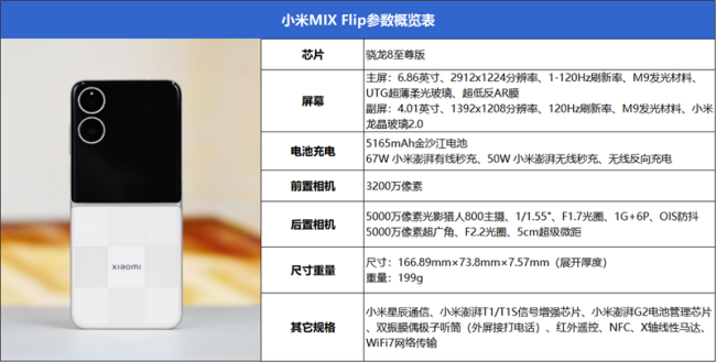 外观方面,小米MIX Flip 2采用了奢侈品经典的“棋盘格”设计,背板纯平无凸起模组或接缝,握持感更佳。外屏尺寸为4.01英寸,内外屏显示素质一致,支持120Hz刷新率和3200nit峰值亮度。镜头Deco延续了上代设计,后置5000万主摄+5000万超广角双摄方案。内屏采用6.86英寸华星光电M9发光材料,支持低亮度高频PWM调光,护眼效果出色。