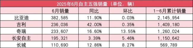在这一背景下,6月份自主5强(比亚迪、吉利、长安自主、奇瑞、长城)销量全部呈现同比正增长。在这5家之中,比亚迪依旧以38万+的排在第一;其余4家的排名也已经连续多月固定,形成了吉利、奇瑞、长安自主、长城这样的梯队。其中,吉利、奇瑞两家连续4个月销量超20万;长城也稳定在10万辆以上;长安自主销量则波动较大。
