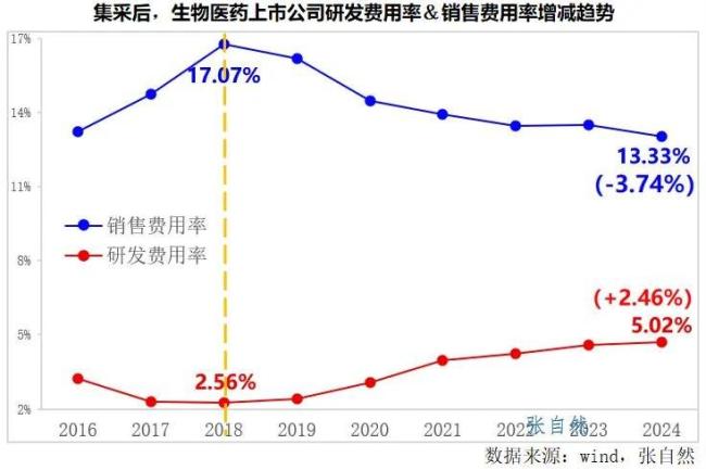 如恒瑞的研发费用率由集采之初2018年的15.3%提高到了2024年的29.4%,6年增加了14.1个百分点;