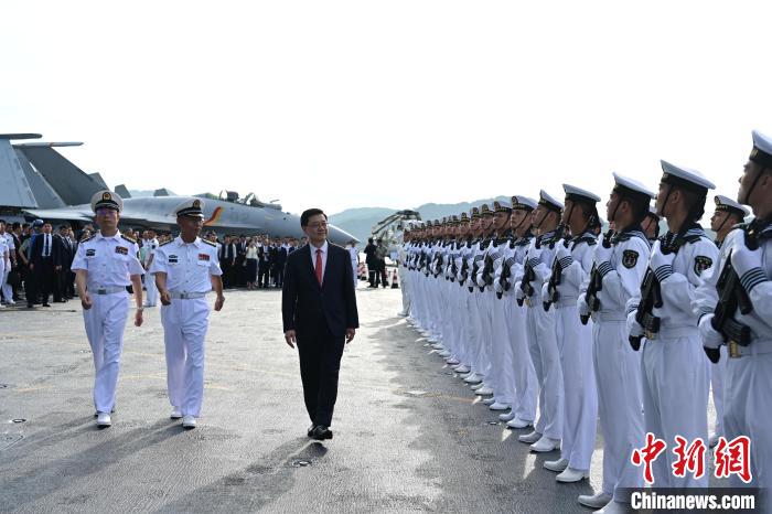 7月3日,香港特区行政长官李家超出席中国人民解放军海军山东舰航母甲板招待会。图为甲板招待会开始前,李家超(左三)检阅仪仗队。(香港特区政府新闻处供图)