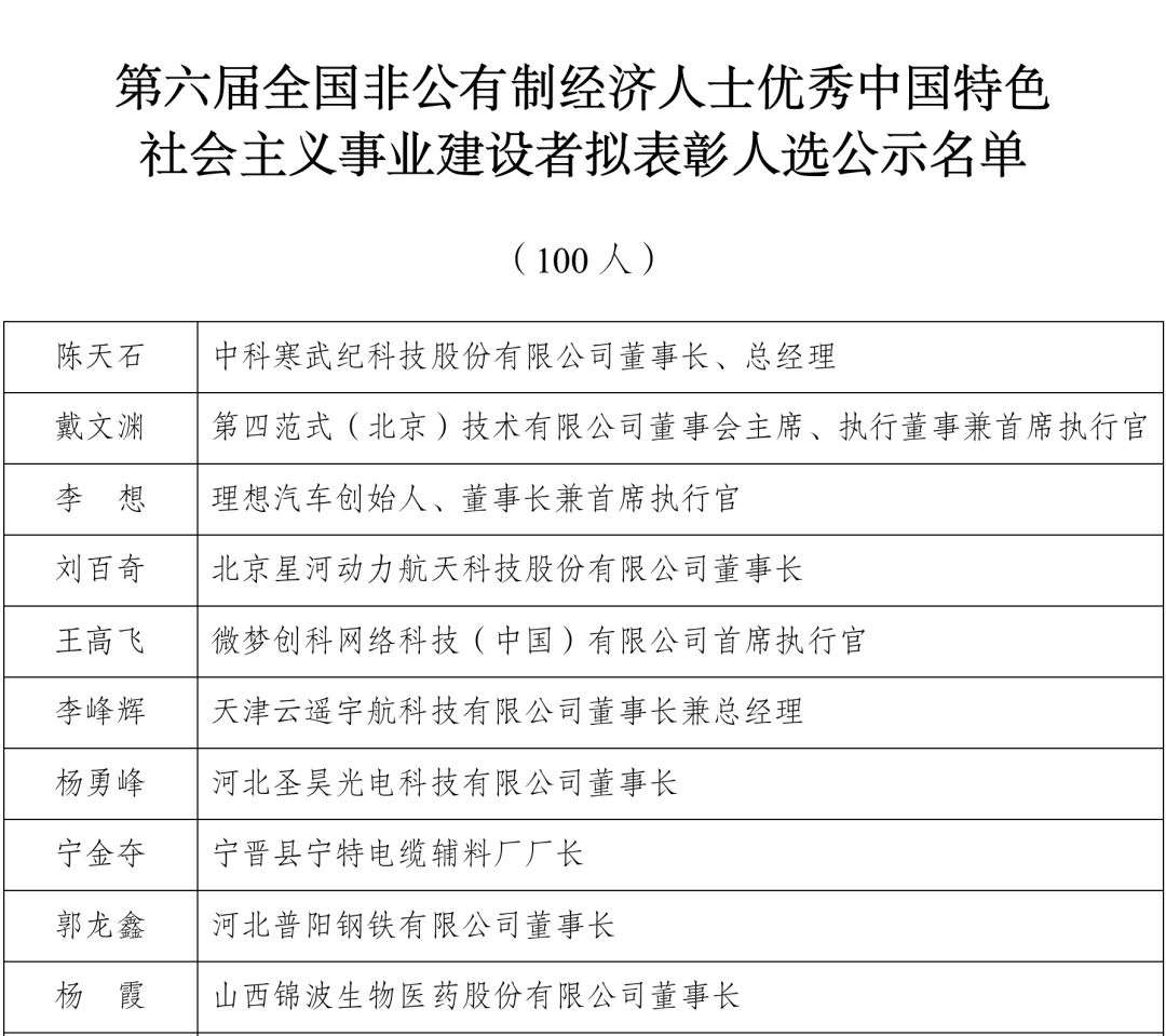 中央统战部、工业和信息化部、人力资源社会保障部、市场监管总局和全国工商联共同开展第六届全国非公有制经济人士优秀中国特色社会主义事业建设者评选表彰活动。为充分发扬民主、广泛听取意见、接受社会监督,现将100名全国非公有制经济人士优秀中国特色社会主义事业建设者拟表彰人选名单和8名后备人选名单予以公示。公示时间从2025年7月7日起,至7月13日止。如对人选名单有异议,请于公示期间通过电话、传真、邮件和信函(以到达日邮戳为准)等方式向第六届全国非公有制经济人士优秀中国特色社会主义事业建设者评选委员会办公室反映。以单位名义反映情况的材料需加盖单位公章,以个人名义反映情况请签署实名,并提供联系电话。