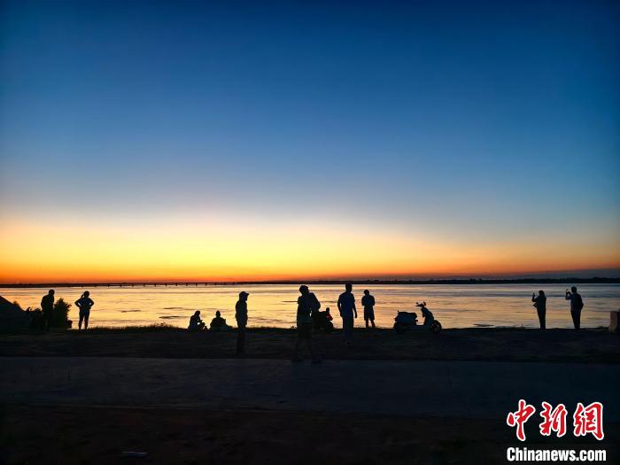 近日,位于河南郑州的黄河岸边,落日将天空与黄河染成一片暖色,水面波光粼粼,水上美景如画。图为市民在黄河案边赏景休闲。禹志超 摄