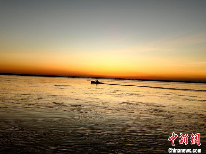 近日,位于河南郑州的黄河岸边,落日将天空与黄河染成一片暖色,水面波光粼粼,水上美景如画。图为落日金辉映黄河。禹志超 摄