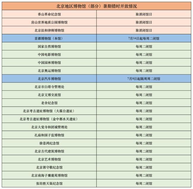 此外,北京汽车博物馆、团城演武厅、北京考古遗址博物馆、北京市白塔寺管理处、北京郭守敬纪念馆、北京文博交流馆等多所博物馆将闭馆日从周一调整为周二,并延长开放时间。香山革命纪念馆、房山世界地质公园博物馆、北京法和律师博物馆在暑期取消闭馆日。