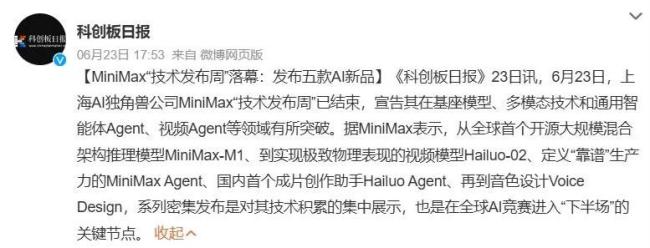 自6月17日以来,MiniMax发布了一系列核心技术与产品更新,涵盖基座模型、视频生成模型、多模态智能体等多个方向,系统展现其“模型--多模态--应用”一体化技术路线。