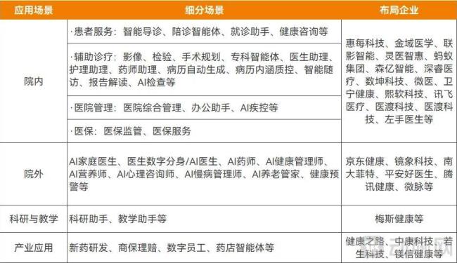 医疗智能体主要应用场景及布局企业,资料来源:公开信息、访谈(表格为不完全统计,部分企业布局多种应用场景,未重复统计)