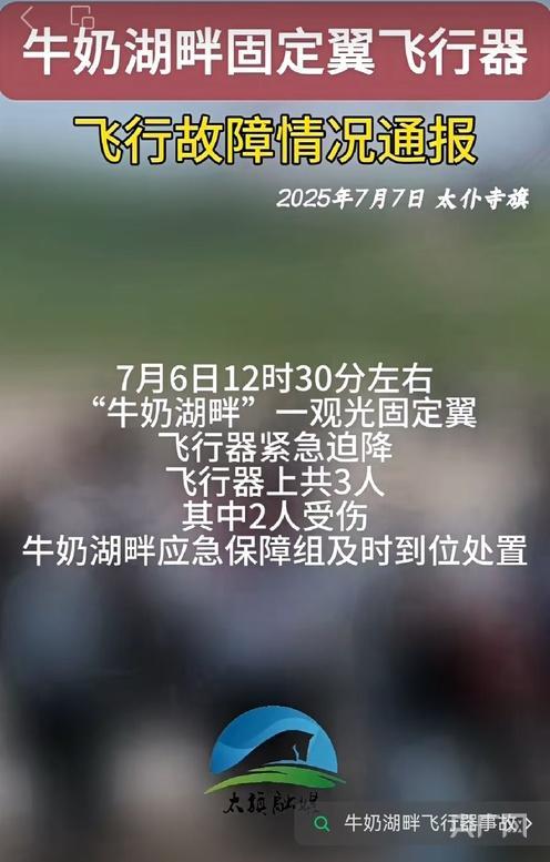 7日下午,太仆寺旗委宣传部通报了此事:7月6日12时30分左右,内蒙古锡林郭勒盟“牛奶湖畔”一观光固定翼飞行器突发紧急迫降情况。飞行器上共有3人,其中2人受伤。应急保障组及时到位处置。受伤游客当晚被送往医院,经医生诊断为轻微伤,无需住院治疗;受伤飞行员为轻伤,7月7日凌晨完成诊疗,现处于观察阶段。目前,涉事飞行营地已被责令停运,相关部门已介入调查。