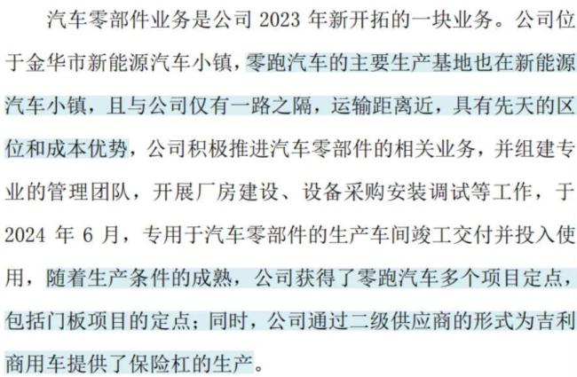 在家电零部件之外,公司于2023年开拓了汽车零部件业务。公司基于地理优势拿到了零跑汽车多个项目定点。
