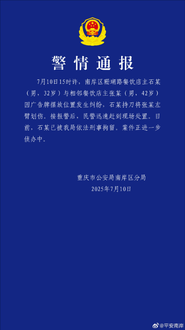 重庆市公安局南岸区分局发布警情通报,7月10日15时许,重庆市南岸区珊瑚路餐饮店主石某(32岁)与相邻餐饮店主张某(42岁)因广告牌摆放位置发生纠纷。在争执过程中,石某持刀将张某左臂划伤。接报警后,民警迅速赶到现场进行处置。目前,石某已被依法刑事拘留,案件正在进一步侦办中。