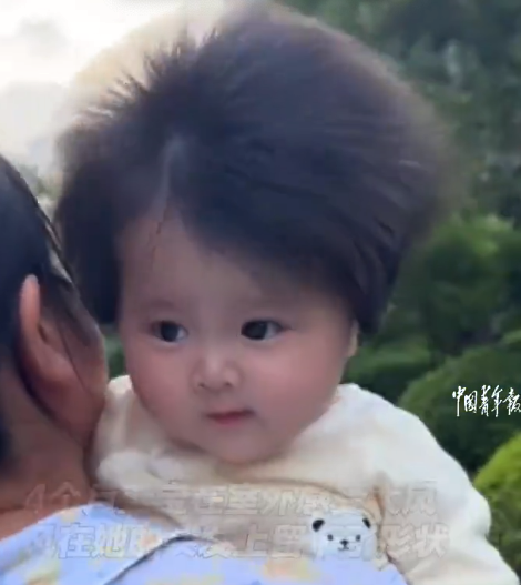 近日,浙江杭州一4个月大的宝宝出门感受风,头发被吹起,像一颗蒲公英,“出生时头发就挺多的,一直没舍得剃胎发”。