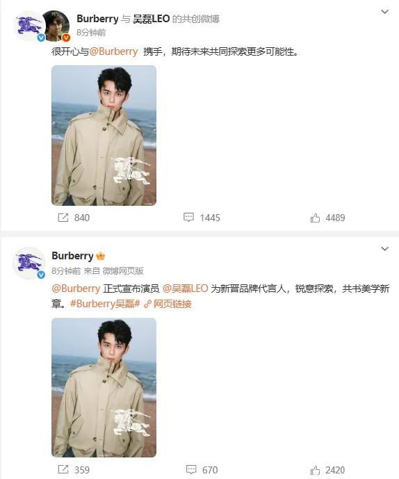 7月14日,Burberry宣布演员吴磊成为其新晋品牌代言人。吴磊出生于1999年12月26日,来自上海市,祖籍四川省广安市,是中国内地影视男演员,毕业于北京电影学院表演系。他于2005年通过出演电视剧《封神榜之凤鸣岐山》中的“小哪吒”一角正式进入演艺圈。