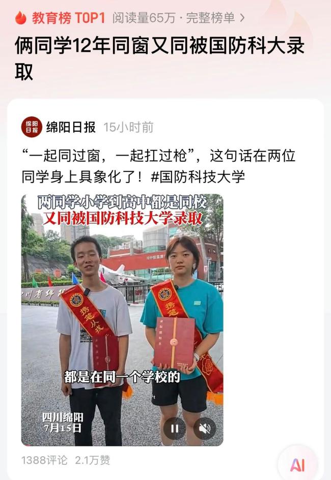 学霸同学热血报国!俩同学12年同窗又同被国防科大录取