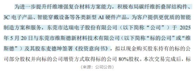 为了顺应消费电子材料轻量化趋势,2025年5月,公司与东莞市维斯德新材料技术有限公司(维斯德)及其股东麦德坤签署《投资意向书》,拟以收购股权和增资方式取得标的公司80%股权。目前该收购事项还在推进中。