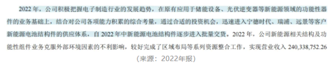 在原有新能源领域功能性器件的业务基础上,公司通过并购得以迅速进入宁德时代、瑞浦、远景等客户新能源电池结构件的供应体系。