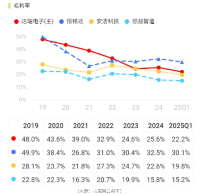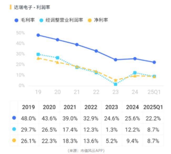 2019年公司毛利率为48%,2025年一季度毛利率已降至22.2%,净利率也从两位数降至个位数。