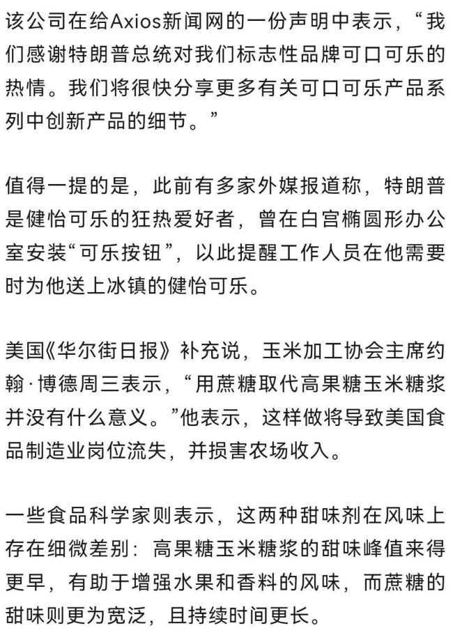 目前,可口可乐在美国的产品中使用的是玉米糖浆。至于该公司是否计划修改原有配方或推出新产品,目前尚不明确。