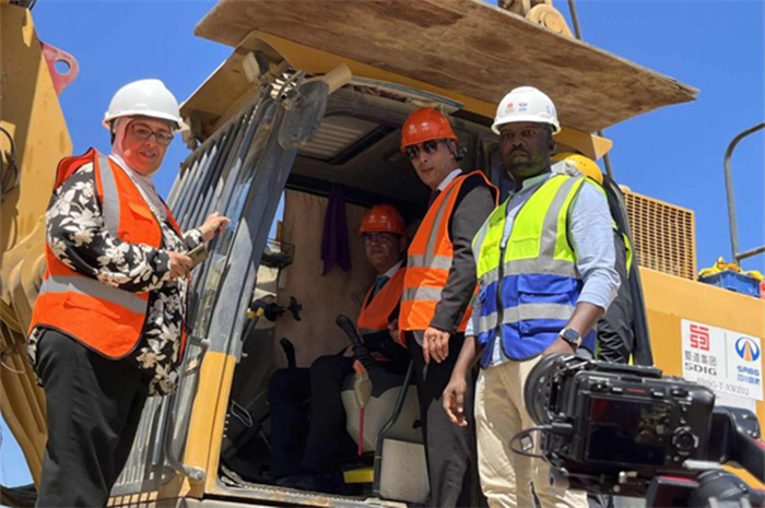 突尼斯住房装备部部长萨拉·扎赫夫拉尼(左二)操作启动旋挖钻。四川路桥供图