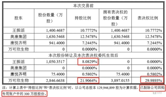 根据康华生物7月20日晚公告,公司控股股东、实际控制人王振滔及其一致行动人奥康集团、持股5%以上股东康悦齐明,拟合计向万可欣生物转让所持有的21.91%股份,转让价格为每股65.03元,合计18.51亿元。王振滔还将其个人持有的剩余8.08%股份所对应的表决权,独家、无偿且不可撤销地委托给万可欣生物行使。这样一来,万可欣生物共计拿下29.99%表决权。