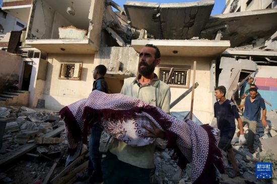 7月23日,在加沙城南郊泰勒哈瓦地区,一名男子抱着以军空袭遇难者遗体。新华社发(里泽克·阿卜杜勒贾瓦德摄)
