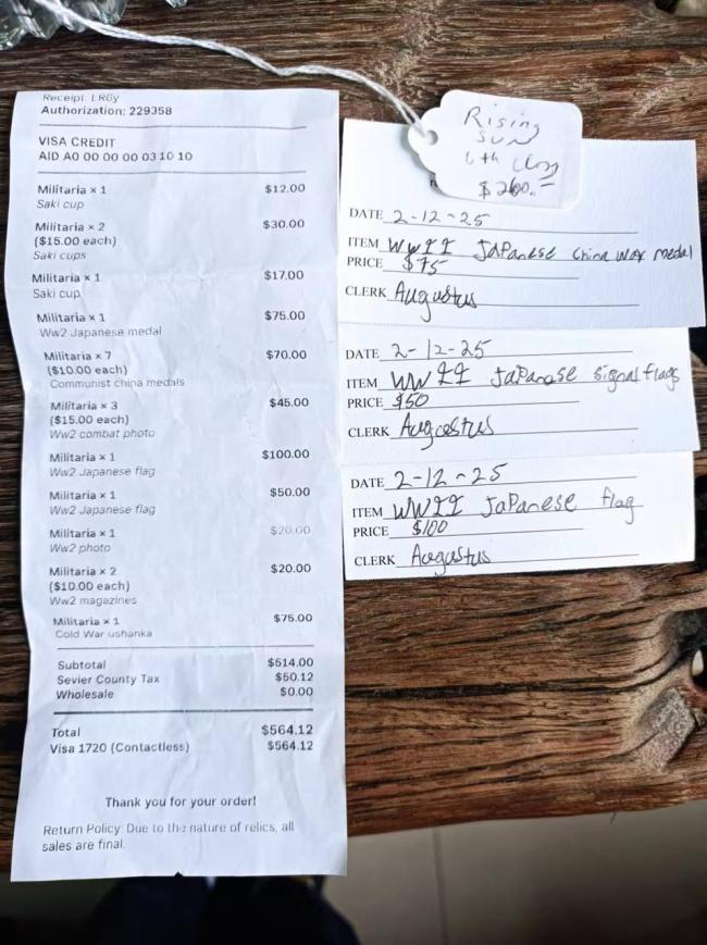王峥嵘是合肥市一家服装企业的老板。他介绍,今年1月,他到美国参加一个行业展会,会后他带着孩子去田纳西州一家军品店游览。在这家店,他发现了一些疑似当年侵华日军遗留下的一些实物。