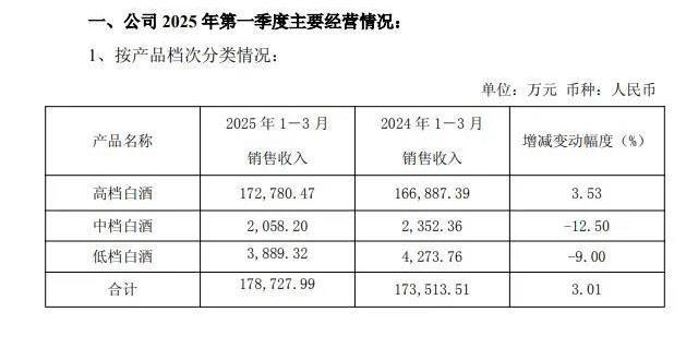 一季度,口子窖实现营业收入18.10亿元,同比增长2.42%;净利润6.10亿元,同比增长3.59%。