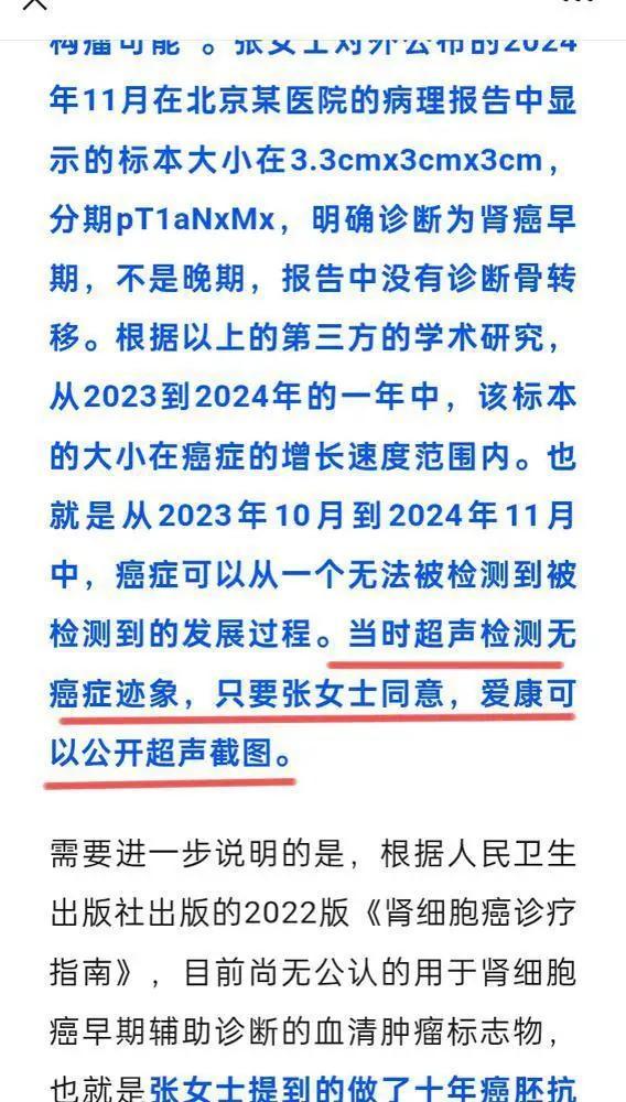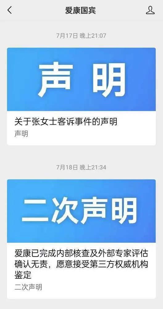 7月18日,爱康国宾公众号两次发布声明称,爱康医疗团队已完成对张晓玲的历年体检报告与档案的核查,并聘请外部专家协助进行数据分析和评估,确认爱康对张女士的肾脏检查不存在瑕疵,报告结论与肾脏超声检查实际情况一致,不存在对于肾脏检查漏诊或误诊情况。并称,爱康完整保留了张女士肾脏超声检查的影像图片文件,只要张女士同意,爱康可以马上公开张晓玲的超声检查影像图片,公开透明,接受医疗专业人士以及公众的审核。