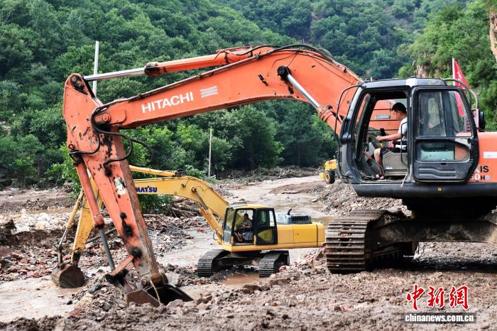 7月31日,河北兴隆县六道河镇抢险救灾现场,正在抢修道路。翟羽佳 摄