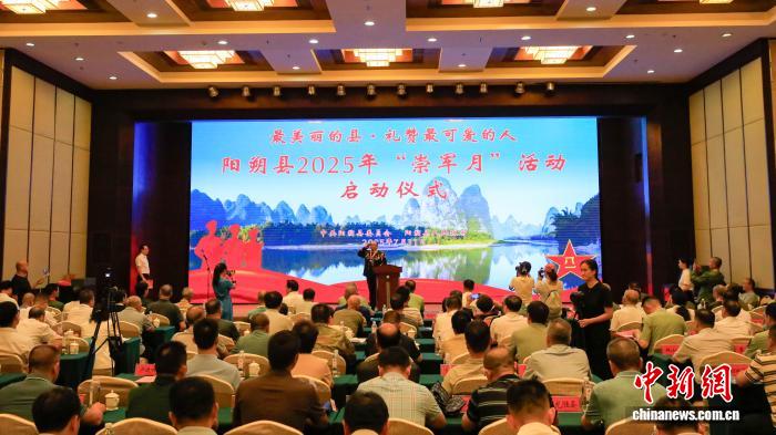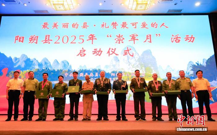 中新网桂林8月1日电(杨宗盛 邓竣缤)八一建军节来临之际,广西桂林市阳朔县举行2025年“最美丽的县·礼赞最可爱的人”“崇军月”活动。7月31日晚,来自广西壮族自治区14个地市的52名烈属军属、功臣模范和退役军人代表受邀参加启动仪式。