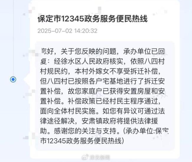 6月初,李女士拨打了保定市12345便民服务热线联系村委会进行咨询,村支部书记添加其微信后告知“外嫁女不享受本村拆迁安置补偿”,并称“村里这样的情况很多,别人都没说什么,为了这点钱不值当”。6月28日,李女士又通过河北省12345小程序反映此事,7月2日,保定市12345便民服务热线回复称,经徐水区人民政府核实,依照八四村村规民约,本村外嫁女不享受拆迁补偿。