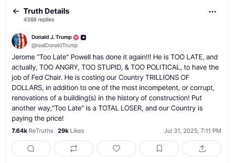 9月降息要泡汤?特朗普再炮轰鲍威尔:他不配担任美联储主席 降息预期降温。美国总统特朗普再次批评美联储主席鲍威尔,称其“根本不配担任美联储主席”。此前,美联储在7月议息会议后宣布继续维持利率不变,鲍威尔的讲话也降低了9月降息的可能性。特朗普在社交媒体上写道:“‘太晚先生’杰罗姆·鲍威尔又来了!他总是太迟,而且实际上,他太愤怒、太愚蠢、太政治化了,不适合担任美联储主席。”特朗普还指责鲍威尔让美国损失了数万亿美元,并称美联储正在进行的装修计划是建筑史上“最无能、最腐败”的翻修。