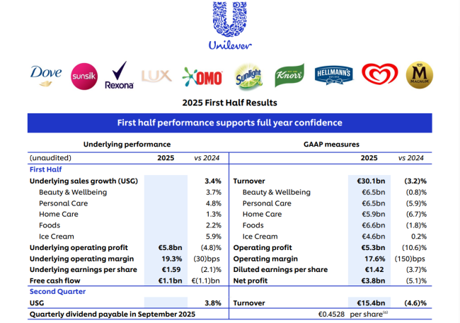 7月31日,联合利华发布的2025年上半年业绩显示,联合利华总营收为301亿欧元,同比下降3.2%,其中受汇率不利因素影响为-4%及净资产处置影响为-2.5%。净利润为38亿欧元,同比下滑5.1%。