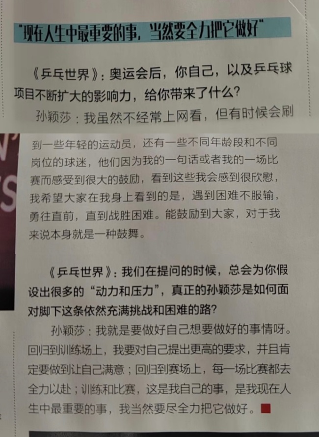 孙颖莎:我就是要做好自己想要做好的事情呀。回归到训练场上,我要对自己提出更高的要求,并且肯定要做到让自己满意;回归到赛场上,每一场比赛都去全力以赴;训练和比赛,这是我自己的事,是我现在人生中最重要的事,我当然要尽全力把它做好。