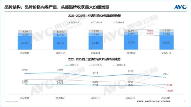 海信空调面临的主要问题,是如何进一步扩大销售规模。该公司在国内新风空调品类占据领先地位,但整体市场份额与TOP 3品牌(美的、格力、海尔)有较大差距。据奥维云网数据显示,2025上半年空调市场在国补刺激下焕发活力,总体销量达3845万台、同比增长15.6%;市场的63.2%被TOP 3品牌占据,TOP4-5/6-8的市场份额分别为15.4%及13.2%,较2024H1变化不大,增长空间较为有限。