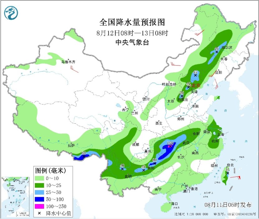 预计今明两天,雨带依然会维持在川渝至苏皖一带,四川、重庆、贵州北部、云南北部、湖北、湖南北部、安徽、江苏等地部分地区仍有暴雨或大暴雨,局地有特大暴雨。其中今天,四川东部和南部、重庆、贵州中西部和东北部、云南北部、湖北东部和南部、湖南西北部、苏皖中部等地部分地区将有大到暴雨,重庆中东部、贵州东北部、湖北西南部、湖南西北部、江苏中部等局地有大暴雨,重庆东南部、湖南西北部等局地有特大暴雨(250~280毫米);上述部分地区伴有短时强降水、雷暴大风或冰雹天气。此外,内蒙古东部、河北西北部等地部分地区将有8级以上雷暴大风或冰雹等强对流天气,最大风力可达11级以上。