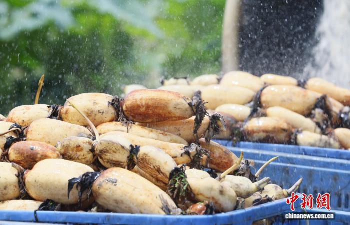 8月9日,在广西贺州市平桂区沙田镇马峰村,藕农正在采收莲藕。黎豪图 摄