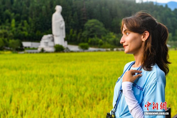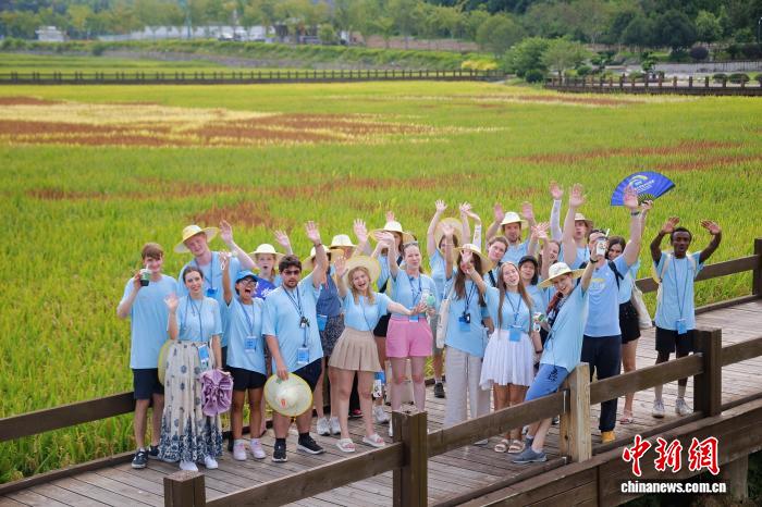 图为世界大学生在五夫镇朱子像前看稻田。福建省广播影视集团 供图