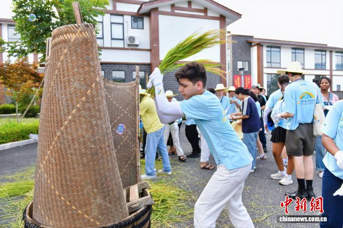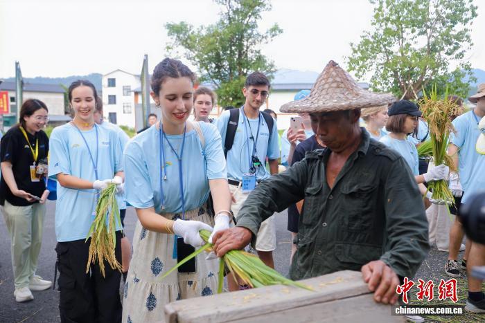 图为世界大学生在体验手工打稻穗。福建省广播影视集团 供图