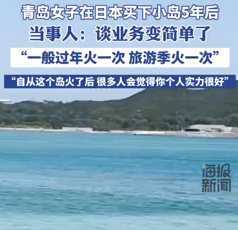 8月11日(采访),山东青岛,5年前青岛女子张书卿在日本买下小岛后走红,张书卿称一般每年过年火一次、旅游季火一次,小岛火了给自己带来的收获就是谈业务变得简单了,“可能不少人觉得你都有岛了,可能实力各方面的背书会有一定提升”。