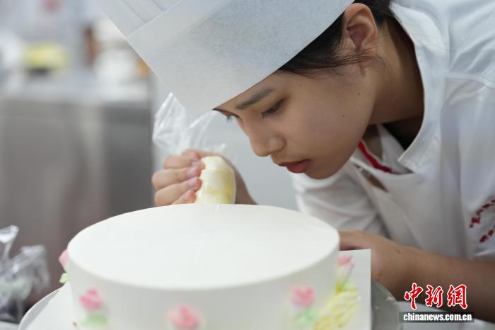 8月13日,台湾青年选手(烘焙项目)陈凯馨正在进行蛋糕裱花。刘鸿鹤 摄
