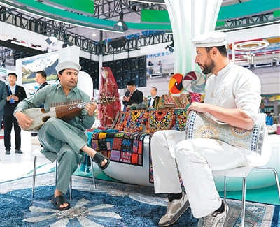 在交易会上,巴基斯坦参展人员为观众演奏。