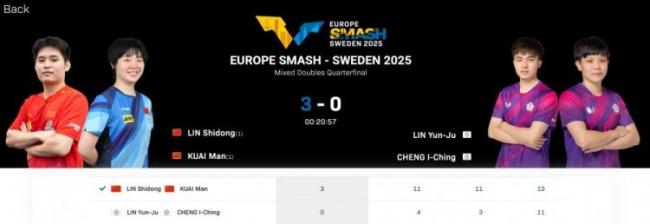 林诗栋和蒯曼在WTT欧洲大满贯瑞典站的混双比赛中,以3-0战胜了林昀儒和郑怡静组合,成功晋级四强。具体比分为11-4、11-3、13-11。接下来,他们将在半决赛中对阵罗马尼亚组合E·约内斯库和斯佐科斯。
