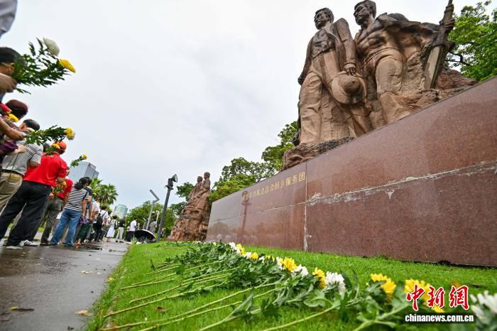 8月25日,海南海口,参加2025海外华文媒体海南采访行活动的海外华媒代表,与南侨机工、琼崖华侨回乡服务团后人等,向《南洋华侨机工回国服务团》《琼崖华侨回乡服务团》两座雕塑默哀、献花,追忆华侨回国支持抗战。中新社记者 骆云飞 摄