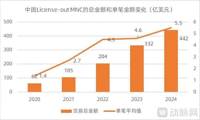 BD单笔平均金额的增长这一现象也可以在另一个口径得到验证。动脉智库统计了销售额排名全球前20的MNC参与国内License-out交易的情况,交易金额的单笔平均值从2021年的2.7亿美元增长到了2024年的5.5亿美元,同样呈现出明显增长的趋势。而且前20大MNC的单笔平均交易金额更高(5.5亿美元VS 2.68亿美元,2024年)。