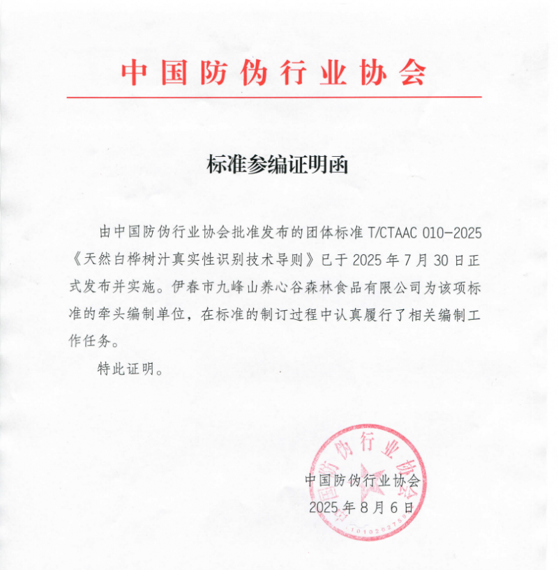 每年春雪初融、白桦树萌发叶芽前的12-15天,是兴安岭天然白桦树汁的黄金采汁期。这是伊春市九峰山养心谷森林食品有限公司(以下简称:九峰山养心谷)在其产业实践中始终遵循的自然节律。2025 年7月30日,《天然白桦树汁真实性识别技术导则》团体标准正式发布并同步实施,这份来自寒地黑土的白桦树汁,终于迎来了科学的真实性识别依据。作为该标准的起草单位之一,九峰山养心谷不仅深度参与了标准的制定过程,更期待这份以核磁共振氢谱指纹图谱为核心的技术导则,能为白桦树汁行业搭建起一道守护天然的屏障。