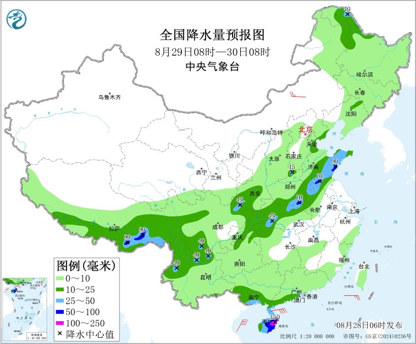 8月29日08时至30日08时,内蒙古东北部、黑龙江西北部、西藏东部和南部、云南中北部、陕西中南部、华北东部、黄淮东部和南部、湖北北部和西部、湖南西北部、华南南部等地部分地区有中到大雨,其中,西藏东南部、山东东部和南部、河南南部、江苏北部、海南岛中东部等地部分地区有暴雨或大暴雨(100~150毫米)。内蒙古中部部分地区有4~5级风。北部湾、琼州海峡、南海北部海域将有5~7级风,阵风8级。